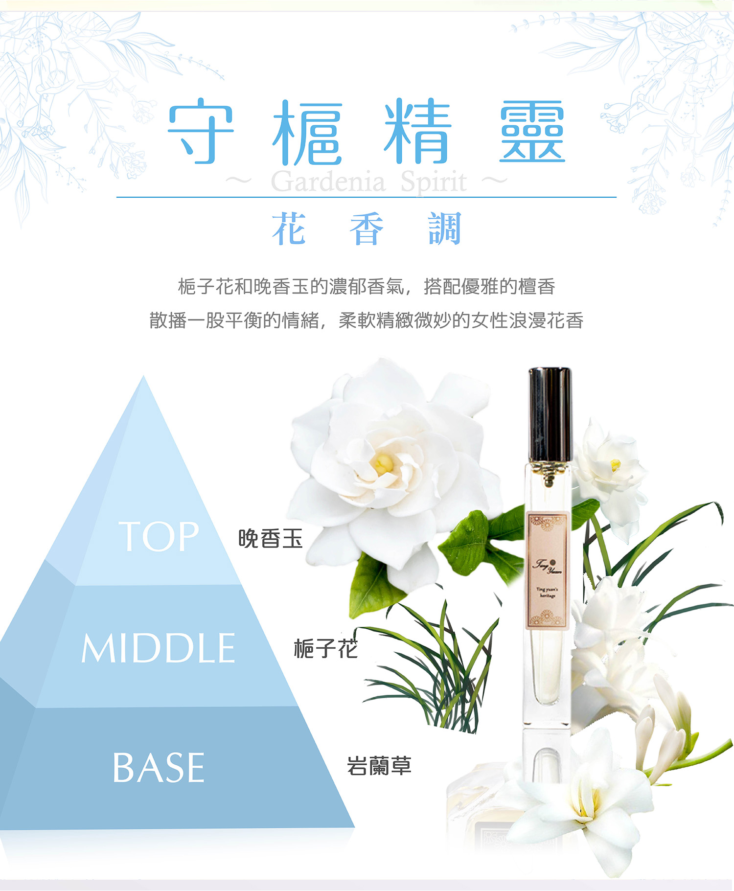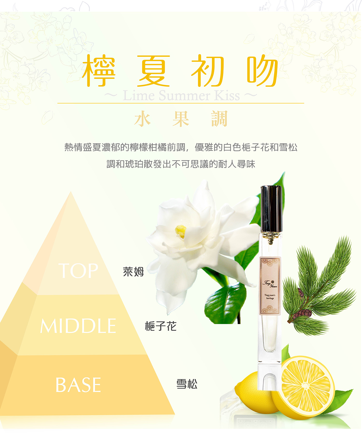 熱情盛夏濃郁的檸檬柑橘前調,優雅的白色梔子花和雪松調和琥珀散發出不可思議的耐人尋味